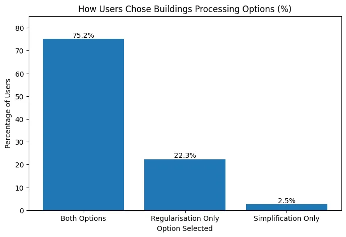 Since then, we have learned that actually most of the users who used "π Buildings" chose both "regularisation" and "simplification" (4,960), and most of the rest of the users used the "regularisation" option (1,473) only, while just a small fraction chose the "simplification" only (165).