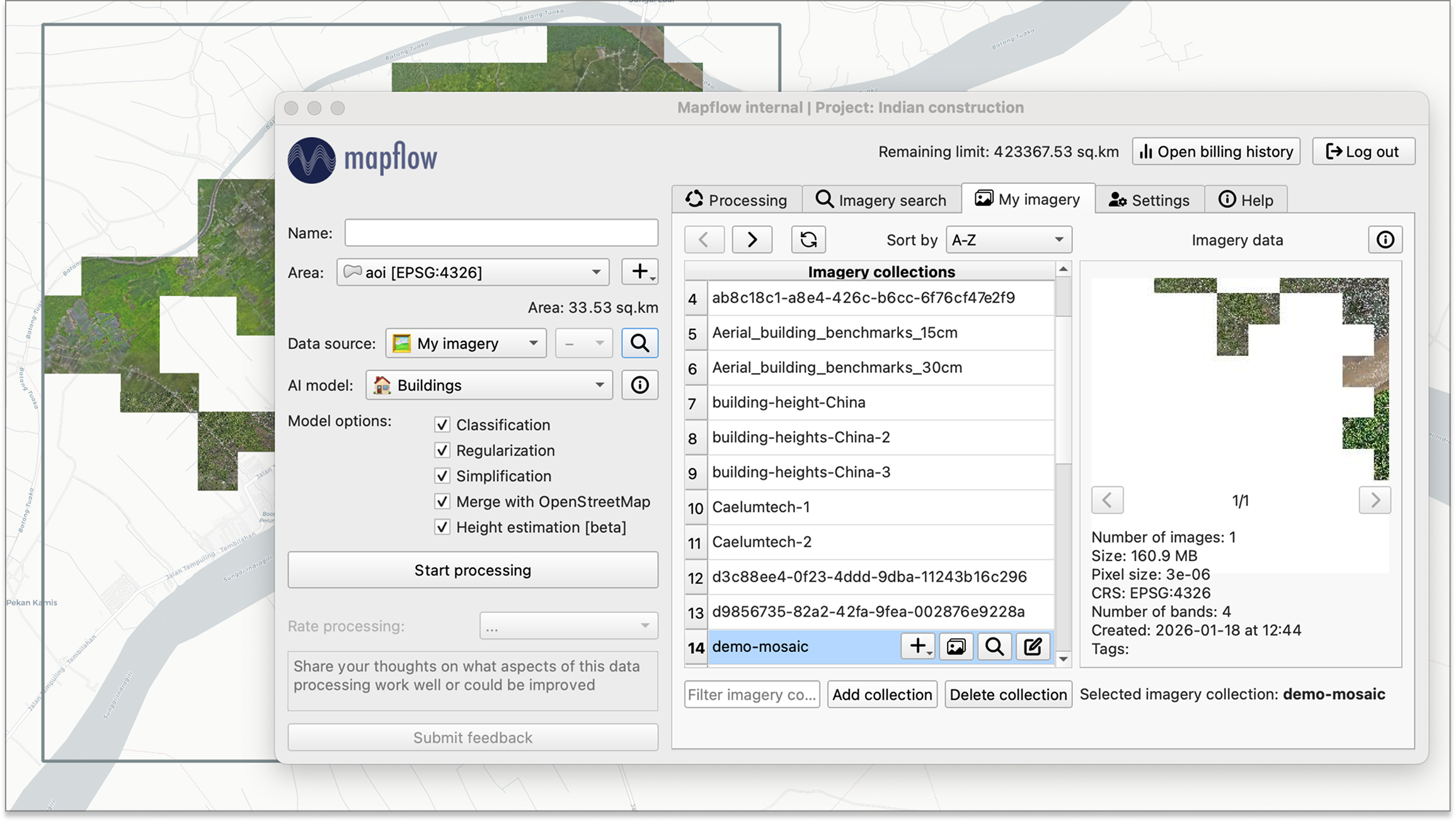 Upload and manage your own GeoTIFF imagery in organized collections. Preview images, run batch processing across multiple files, and use collection or image extent as the area of interest.