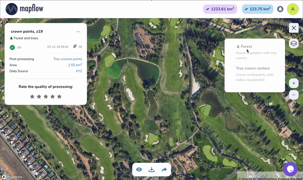 View processing results on the built-in interactive map with layer switching and legend. Inspect feature attributes including area, class, and height. Rate results to help improve models.